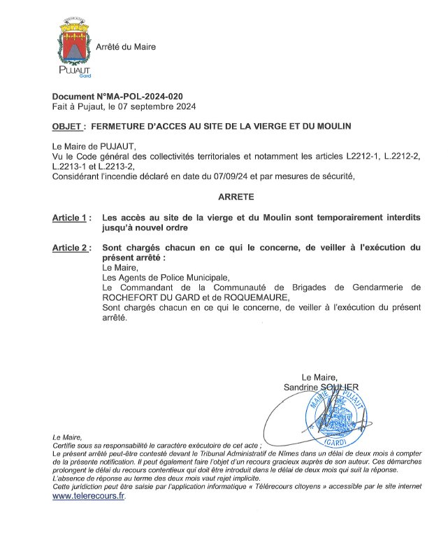En raison de l'incendie survenu ce jour et par mesures de sécurité, les accès au site de la vierge et du moulin sont temporairement interdits et ce, jusqu'à nouvel ordre.